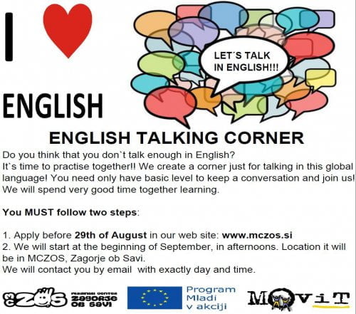 Želiš na zabaven in sproščen način malce izboljšati svojo angleščino? Potem se nam le pridruži v našem prav posebnem “Angleškem kotičku”, kjer se bo z vami v prijetnem vzdušju družila naša prostovoljka iz Španije, Elena.